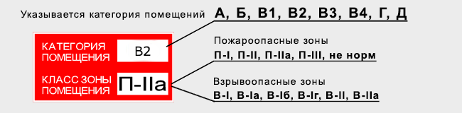 В соответствии с пунктом 20 Правил противопожарного режима в Российской Федерации, утвержденных Постановлением Правительства РФ от 25.04.2012 N 390, руководитель организации обеспечивает наличие на дверях помещений производственного и складского назначения и наружных установках обозначение их категорий по взрывопожарной и пожарной опасности, а также класса зоны в соответствии с главами 5, 7 и 8 Федерального закона «Технический регламент о требованиях пожарной безопасности».